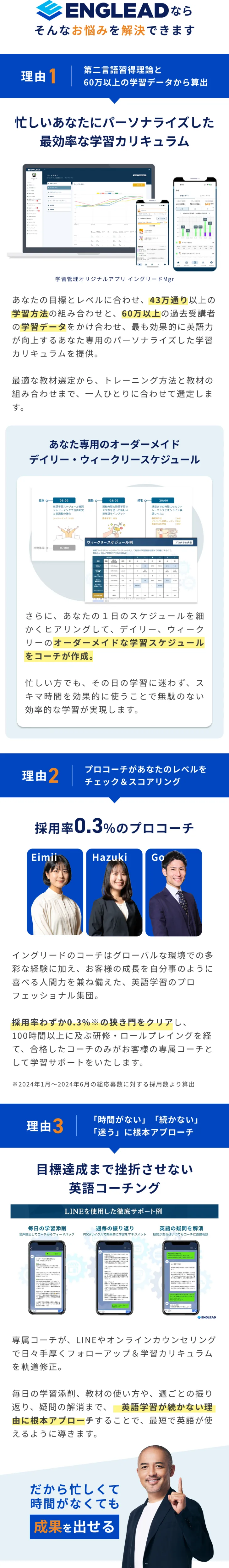 イングリードでは特にコーチの質にこだわっており、採用率0.3%のプロコーチが、あなたの「本気で英語が伸ばしたい」という覚悟を責任をもってマンツーマンサポート。