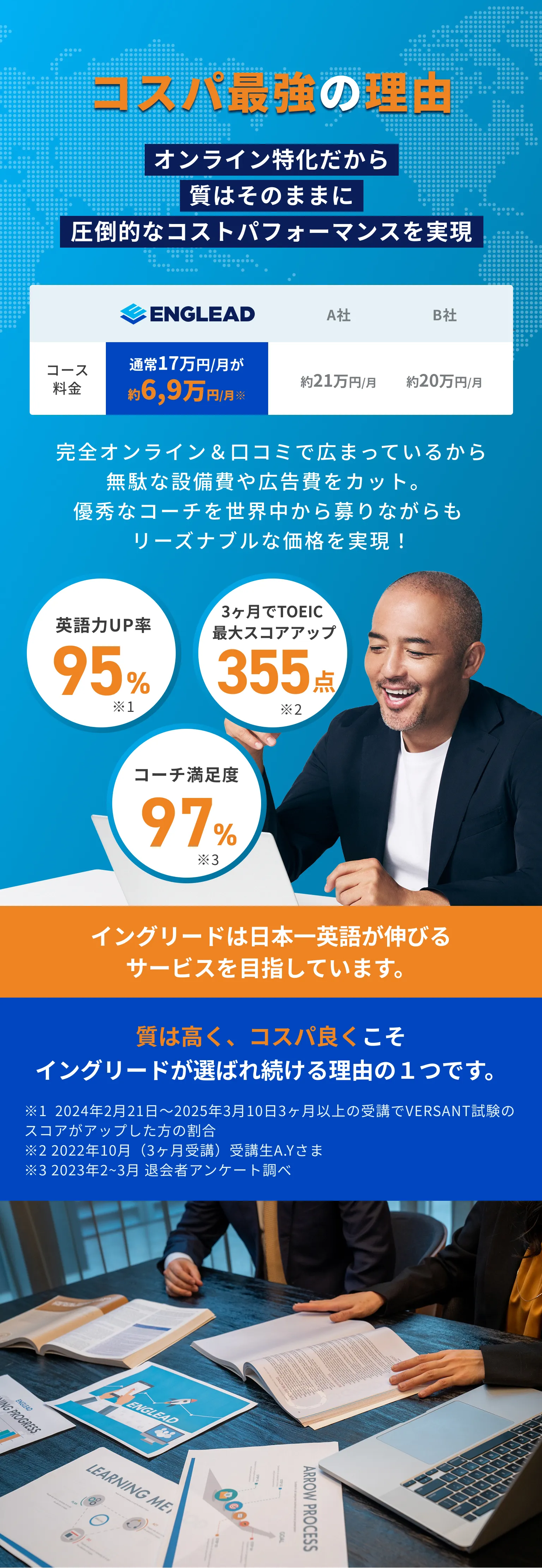 また独自に60万を超える学習データをもとに一人一人最適なカリキュラムを作成、挫折せずに目標達成に向かえるため、英語力UP率98%を誇ります。