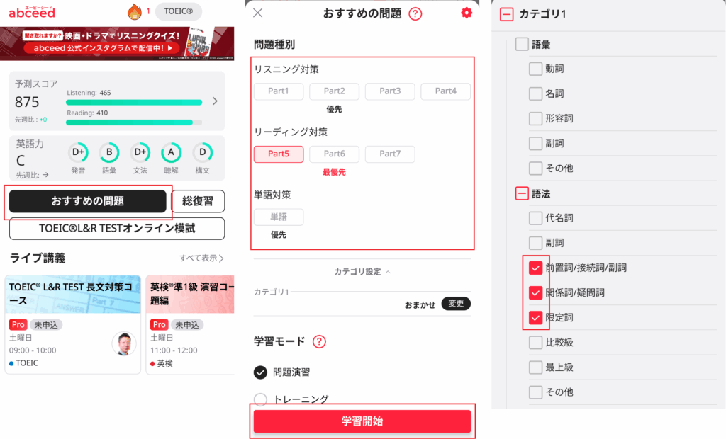 abceedのトップ画面から「おすすめの問題」をタップします。もし「おすすめの問題」が表示されていない場合は、「TOEIC L&R オンライン模試」を1回受験して予測スコアが表示されている状態にすると「おすすめの問題」ボタンが表示されます。