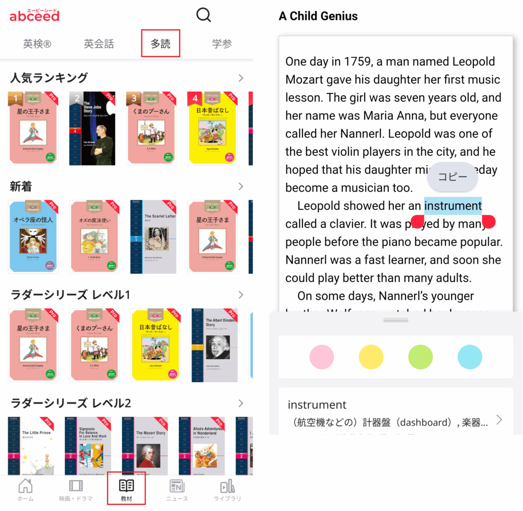 画面下のメニューから「教材」をタップし、画面上部の「多読」のタブを選びます。するとラダーシリーズの教材がレベル別に表示されますので、読みたい教材を選びます。