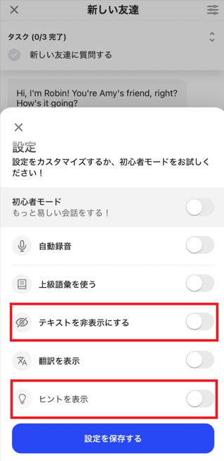 「ヒントを非表示にする」→ 会話中、会話を助けるための文字ヒントが表示されなくなります。