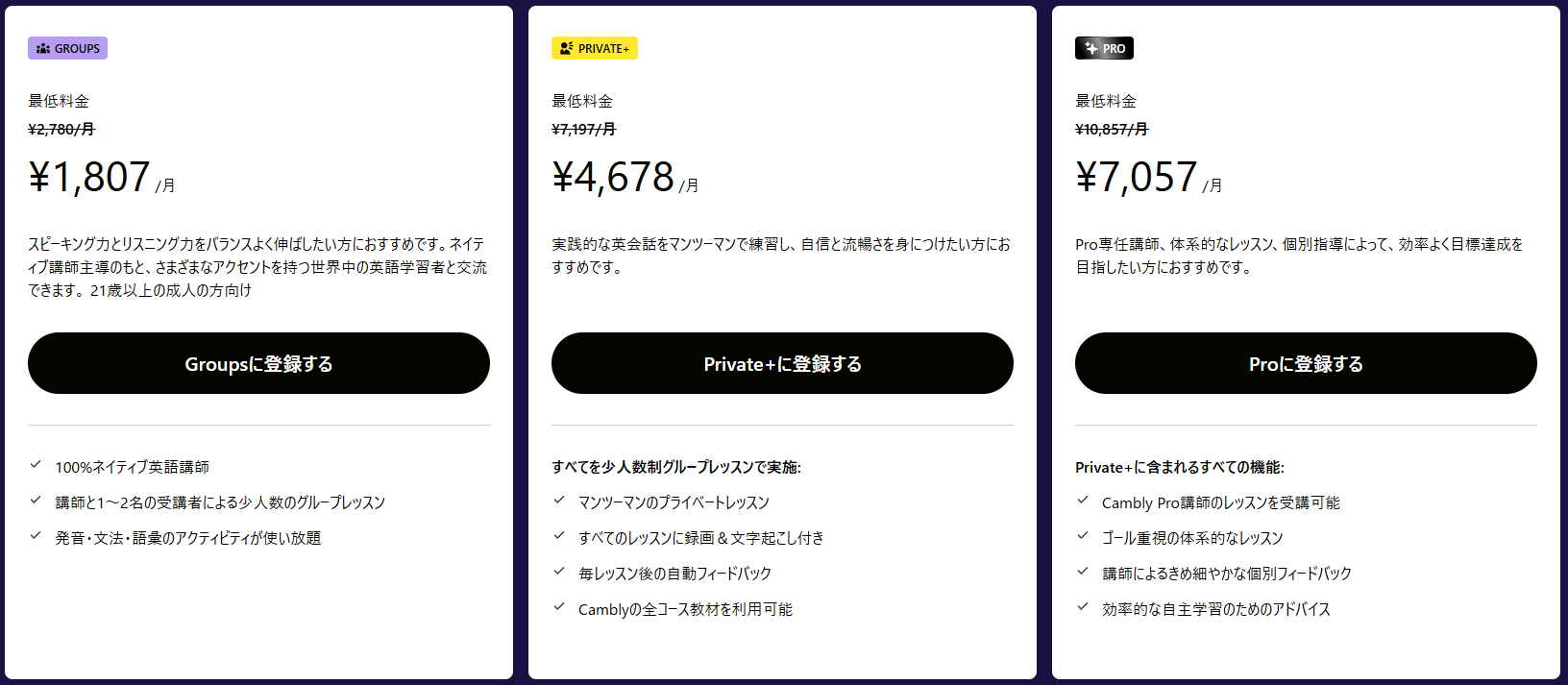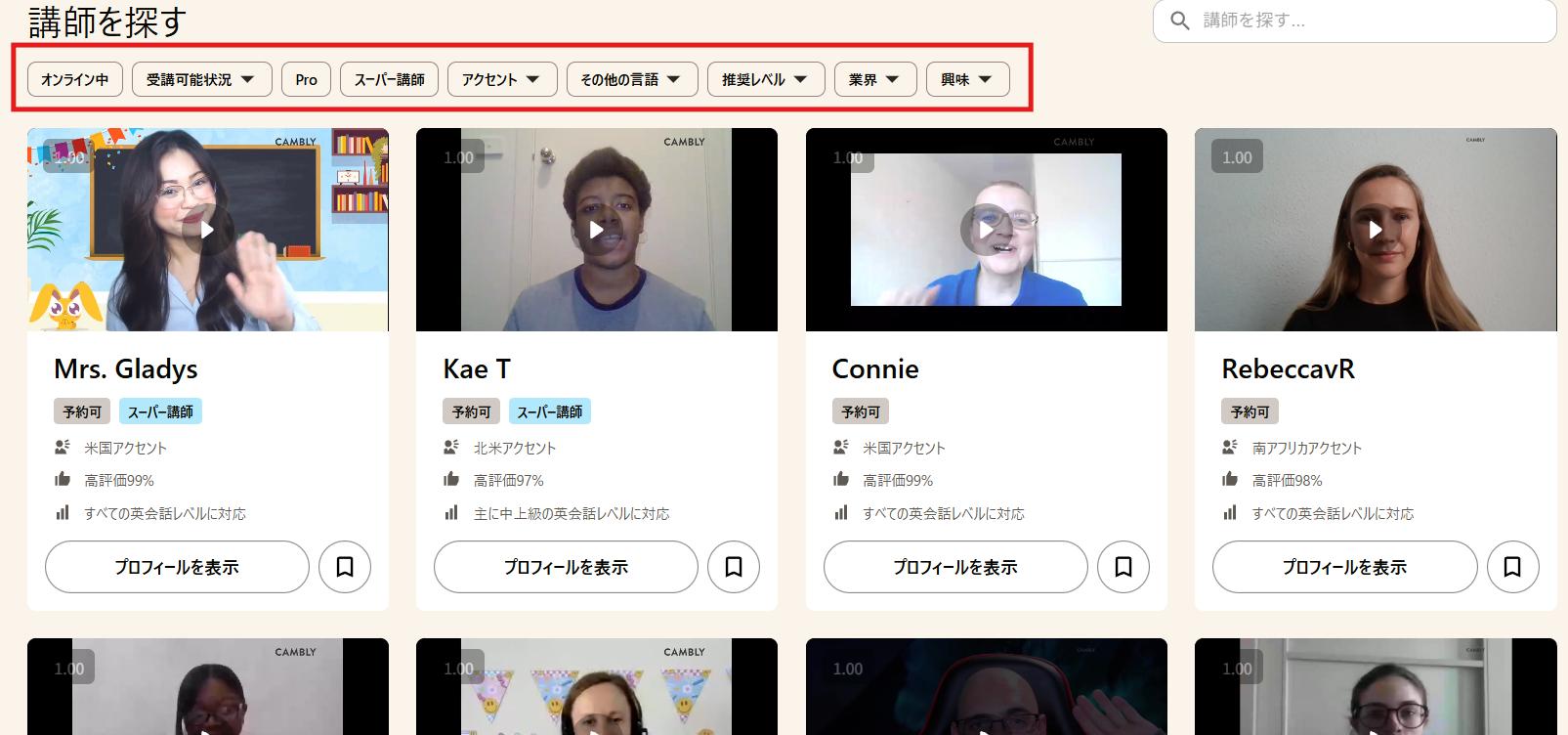 Cambly Pro講師のレッスンを受講可能。