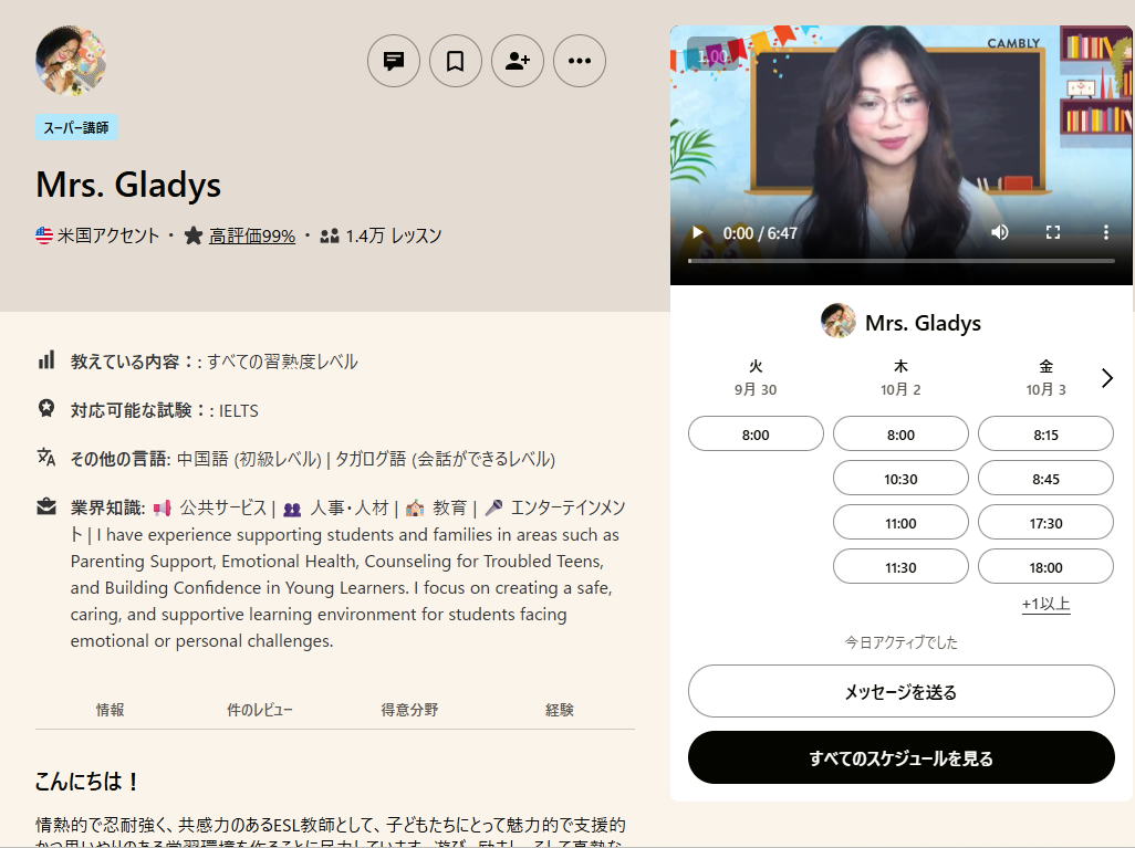 講師プロフィールを確認し、開始時間とレッスン時間を選択します。