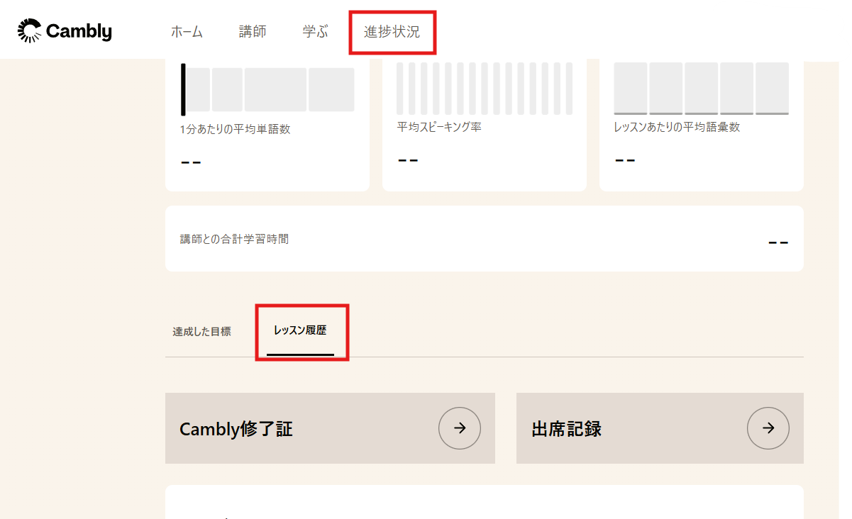 トップ画面上部の「進捗状況」タブから「レッスン履歴」をクリックします。