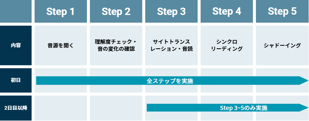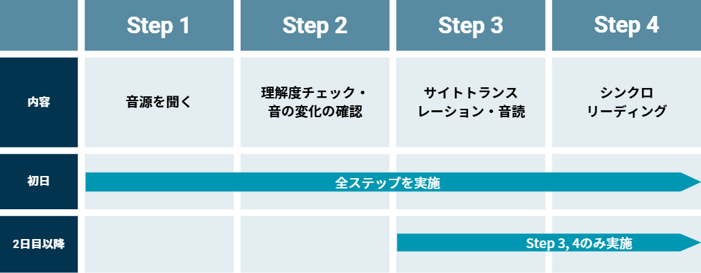 2日目以降のシンクロリーディングでは、スクリプトの内容を頭の中で追いかけるイメージで意味を理解しながらトレーニングを行ってください。