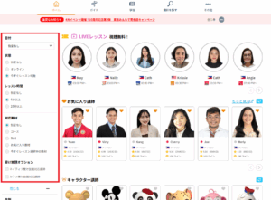トップ画面の左側から講師を検索します。迷った場合はフィリピン人講師の評価が4.95以上の方を選ぶとレッスンの質が安定します。