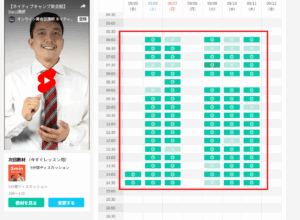 公式プロフィール画面から「予約する」のタブをクリックし、予約時間を確定します。◎がついている時間枠が予約可能です。