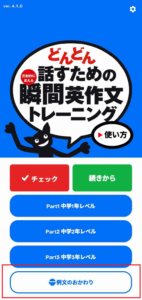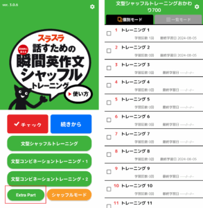 購入後は「どんどん話すための瞬間英作文」の場合は各Partに追加例文が表示され、スラスラ瞬間英作文ではExtra Partとして「文型シャッフルトレーニングおかわり700」が追加となります。