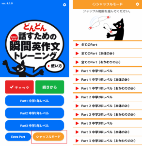 トップ画面から「シャッフルモード」を選択し、次の画面でシャッフルの学習範囲を選択します。「(本体のみ)」は元々あった例文のみでのシャッフル、「(おかわりのみ)」は追加となった例文のみでのシャッフル、何も記載がないものは本体とおかわりを併せた全てをシャッフルして出題します。